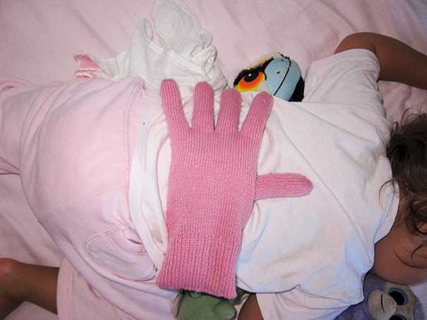 5. Yorgunsanız ve bebeğinizin uyurken sevgiye ihtiyacı varsa bir eldivenin içine fasulye doldurun, onun üzerine koyun.