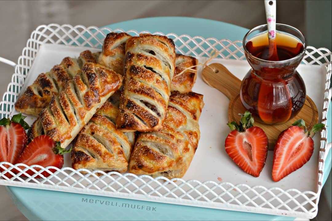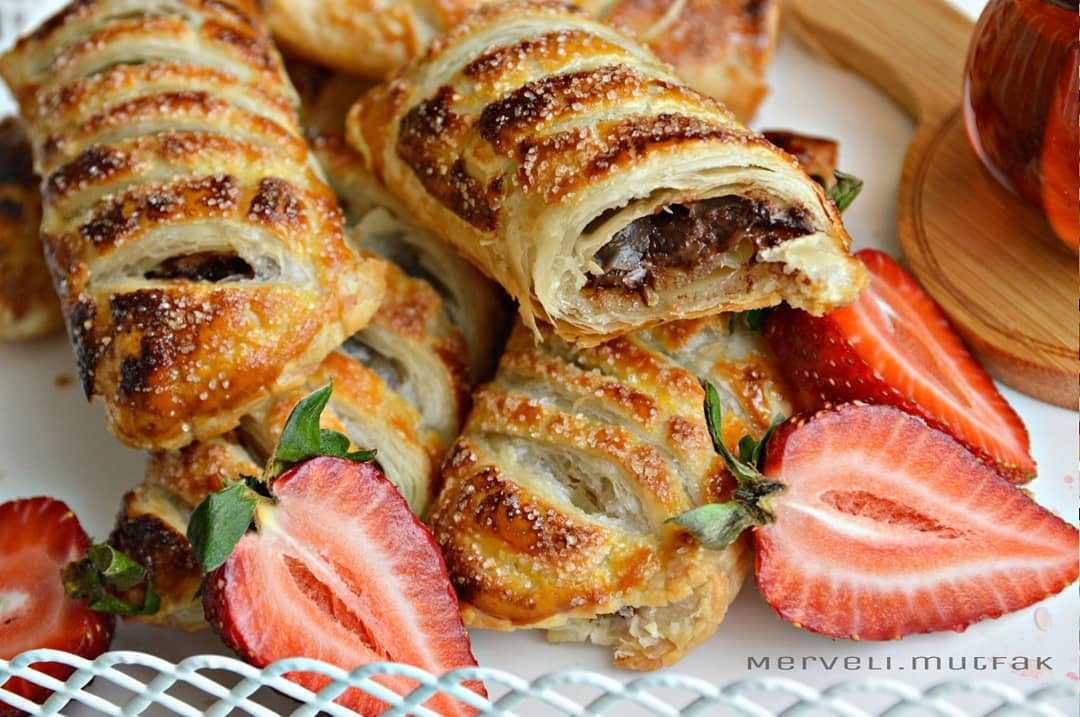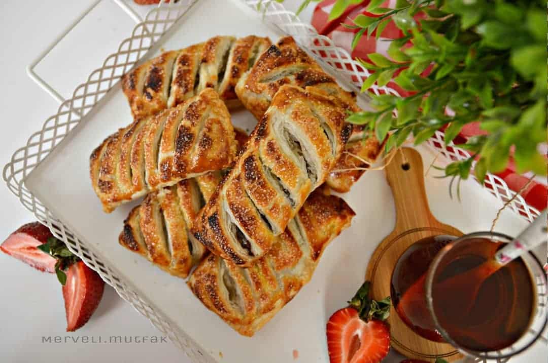 Milföylerin biraz çözülmesini bekleyelim. Ortadan bölelim. Her karenin tam ortasına çikolatadan sürelim. Her iki tarafıda ortaya katlayalım birleştirelim. Kenarlarıda biraz bastıralım kapatalım. Üzerlerine yumurta sarısını sürelim. Bıçakla çizgiler atalım şeker serpiştirelim. 180 derece fırında yaklaşık 20 dakika üzerleri kızarana kadar pişirelim.